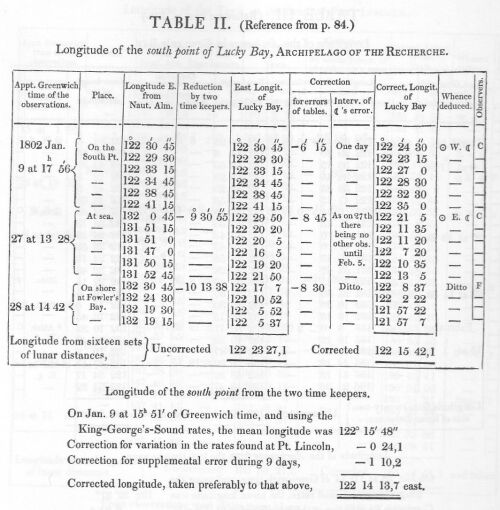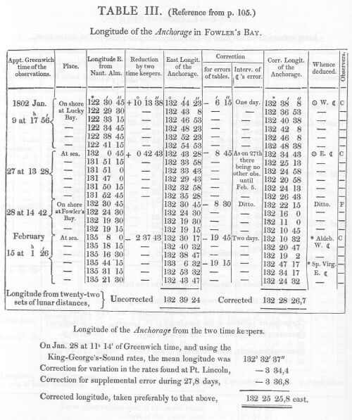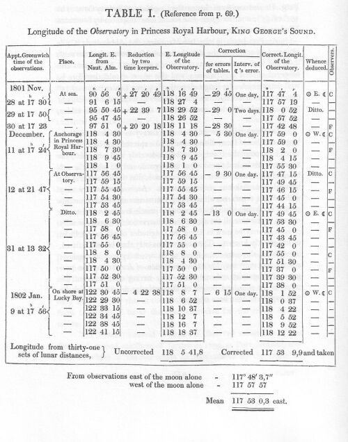 The lunar distances and other observations taken in the Investigator's voyage having been ordered by the Commissioners of the Board of Longitude to be recalculated by a professed astronomer, with every degree of correctness which science has hitherto been able to point out as necessary, this delicate, but laborious task was assigned to Mr. John Crosley, formerly assistant at the Royal Observatory at Greenwich; a gentleman who formed part of the expedition as far as the Cape of Good Hope, but whose ill health had then made it necessary to relinquish the voyage and return to England. The data and results of all the observations will probably be made public, by order of the Commissioners; but in the mean time, for the satisfaction of the geographer, and more especially for that of the seaman, whose life and property may be connected with the accuracy of the charts., the results of the lunar distances observed upon each coast are added in the form of an Appendix to the volume wherein that coast is described. It is by these results that the time keepers have been regulated; and the longitudes used in the construction of the charts are taken from the time keepers.