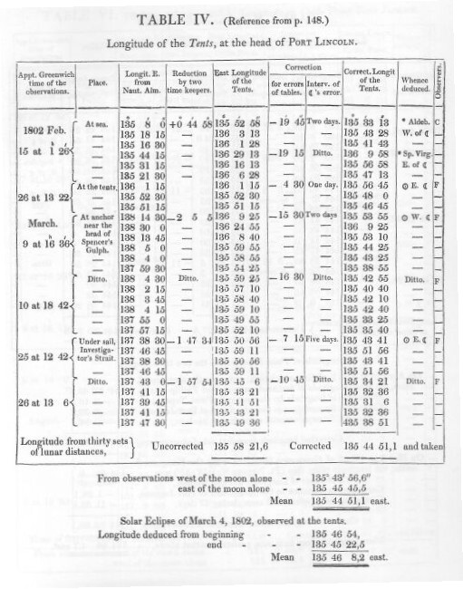 In Port Lincoln, I observed an eclipse of the sun with a refracting telescope of forty-six inches focus, and a power of about two hundred. It was recalculated by Mr. Crosley from Delambre's and Burckhardt's tables, the one made four and the other ten years afterwards. The longitude deduced from the beginning differed only 1' 31.5" from that at the end, and the mean of both only 1' 17" from thirty sets of lunar distances corrected for the errors of the tables.