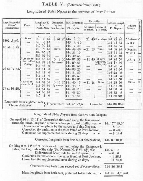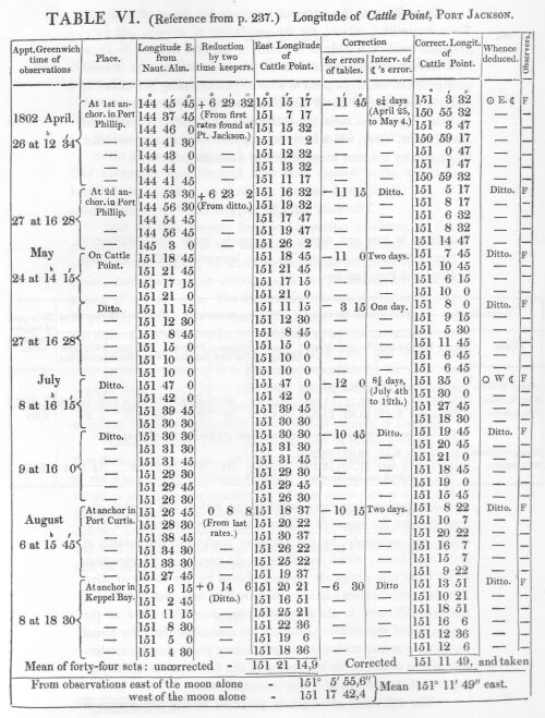 [* In 1795 and 1796 I took sixty sets of distances upon Cattle Point, an equal number on each side, which gave the longitude 151° 17' 12"; but these observations not having been calculated with great nicety, nor corrected for the errors of the lunar and solar tables, the result is not considered to be of equal authority with that given above. The present admiral D'ESPINOSA, when an officer in the voyage of Malaspina, observed an eclipse of the sun at Port Jackson, and occultations of the first and second satellites of Jupiter, from which he deduces the longitude of the town of Sydney to be 151° 12' 45" east of Greenwich; not differing more than a minute of longitude from the above forty-four sets of corrected lunar observations.]