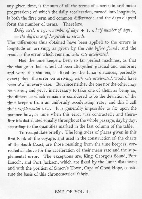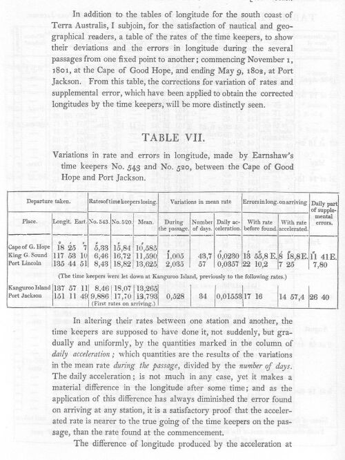 The mean is 17' 16" more than deduced from the lunar observations; and when rates are used equally accelerating from those at Kangaroo Island, to what were found on first arriving at Port Jackson, the longitude by the time keepers would still be 14' 57.4" to the east; so that they appear to have gone less regularly during this passage than before. In fixing the longitudes of places between the two stations, the time keepers with their accelerated rates have been used; and the error of 14' 57.4" has been corrected by quantities proportionate to the times of observation, between April 6 at Kangaroo Island, and May 9 at Port Jackson.
