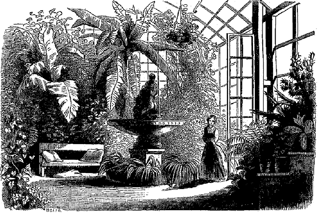 Ce jardin, vaste et magnifique, est séparé par un mur du petit jardin situé au-dessous de moi. Les deux maisons, les deux jardins sont la même propriété, et, de la hauteur où je suis logé, je plonge dans l'une comme dans l'autre. J'ai regardé machinalement. J'ai vu une femme qui m'a paru fort belle, quoique très-pâle et un peu grasse. Elle traversait lentement une allée sablée pour se rendre à une serre dont j'aperçois les fleurs brillantes, quand un rayon de soleil vient à donner sur le vitrage.