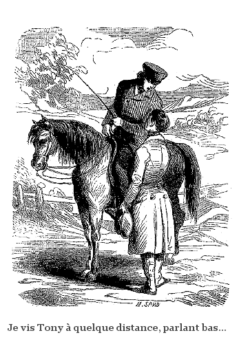 Mon cocher et mes chevaux m'attendaient là pour me conduire jusque chez moi. En payant les postillons, je vis Tony à quelque distance, parlant bas et avec beaucoup de vivacité au jeune cavalier, qui avait mis pied à terre. Tony riait, frappait dans ses mains, et l'autre paraissait chercher à contenir cette pétulance. Je crus même voir qu'il lui donnait de l'argent, et cela me parut fort suspect, d'autant plus que, lorsque je rappelai Tony pour partir, je le vis tenir l'étrier de son nouveau protecteur, et prendre congé de lui en lui faisant des signes d'intelligence. Nous nous remîmes en route pour cette dernière étape, et l'étranger nous suivit à quelque distance.