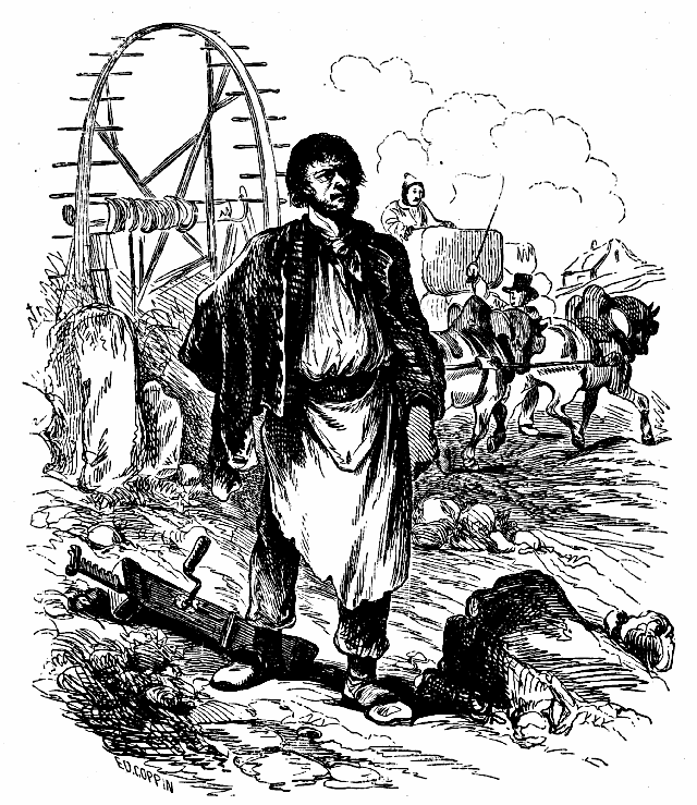 La plaine qui se développe à l'entrée du Petit-Montrouge est étrange d'aspect. Au milieu des prairies artificielles, des champs de carottes et des plates-bandes de betteraves, s'élèvent des espèces de forts carrés, en pierre blanche, que domine une roue dentée, pareille à un squelette de feu d'artifice éteint. Cette roue porte à sa circonférence des traverses de bois sur lesquelles un homme appuie alternativement l'un et l'autre pied. Ce travail d'écureuil, qui donne au travailleur un grand mouvement apparent sans qu'il change de place en réalité, a pour but d'enrouler autour d'un moyeu une corde qui, en s'enroulant, amène à la surface du sol une pierre taillée au fond de la carrière, et qui vient voir lentement le jour.