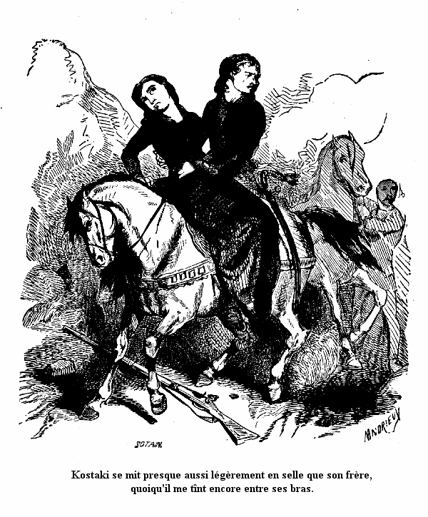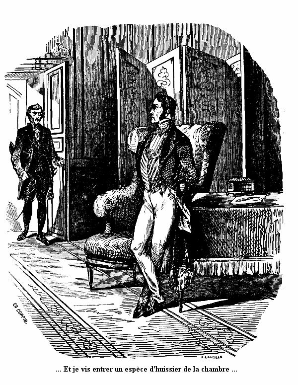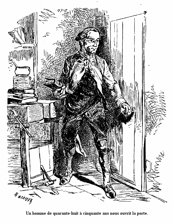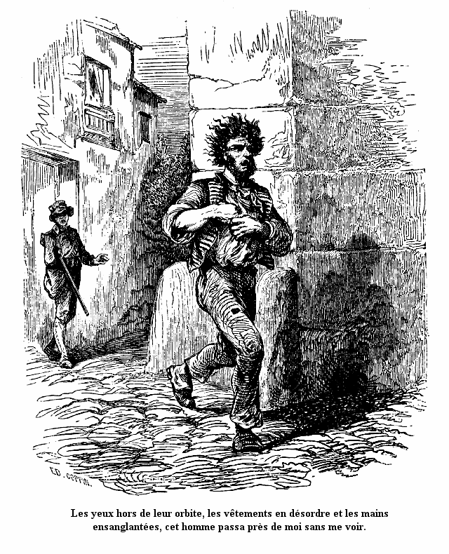 Je suivais un mur qui me paraissait clore une assez belle propriété, lorsque, en arrivant à l'endroit où la rue de Diane s'embranche avec la Grande-Rue, je vis venir à moi, du côté de l'église, un homme d'un aspect si étrange, que je m'arrêtai et qu'instinctivement j'armai les deux coups de mon fusil, mû que j'étais par le simple sentiment de la conservation personnelle.