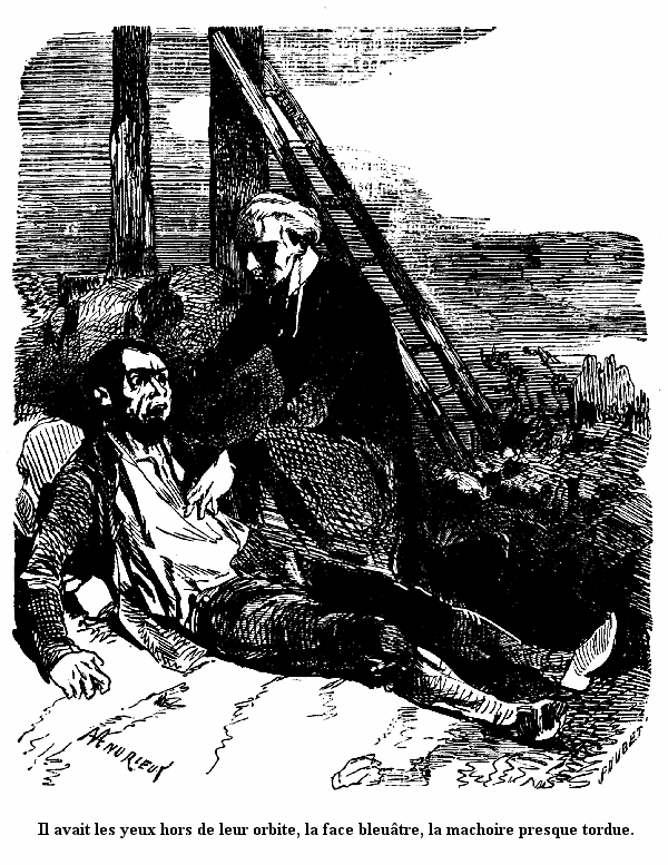 Mais, pâle, les cheveux hérissés, les yeux hors de leur orbite, les vêtements en désordre et les mains ensanglantées, cet homme passa près de moi sans me voir.—Son regard était fixe et atone à la fois.—Sa course avait l'emportement invincible d'un corps qui descendrait une montagne trop rapide, et cependant sa respiration râlante indiquait encore plus d'effroi que de fatigue.