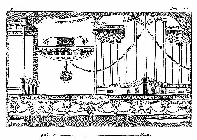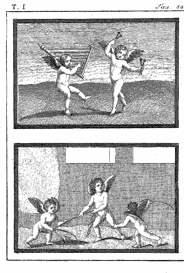 Cette fresque, admirable dans toutes ses parties, représente le premier des travaux d'Hercule, quand, encore au berceau, il étouffe les deux serpens suscités par Junon pour le faire périr. Le mouvement d'Alcmène exprime avec vivacité toute la terreur dont elle est pénétrée. D'un côté, on voit Amphytrion avec le sceptre, comme un des princes d'Argos, et portant la main à l'épée pour chasser les serpens, suivant la belle description que Théocrite nous a laissée de cet événement; de l'autre côté, un pédagogue tient dans ses bras Iphiclus effrayé, bien différent de l'intrépide enfant. Pline, en nous donnant la description d'une semblable peinture de Zeuxis, pourrait faire soupçonner que celle-ci en est l'imitation. On doit faire attention au costume barbare dont le peintre a revêtu le pédagogue; ce costume est convenable à la condition d'esclave, d'où étaient ordinairement tirés les pédagogues aux temps héroïques. Hercule porte un collier, parure qui était en usage parmi les enfans de distinction. L'ornement qui est au bas est indépendant du sujet.