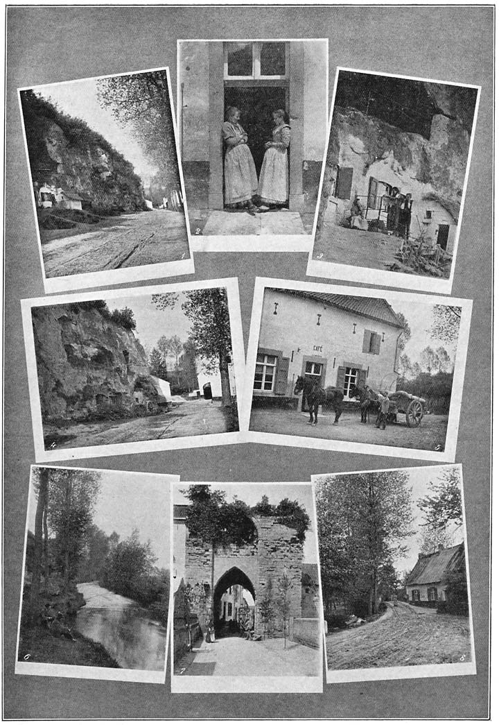 1. Rotswoning.—2. De dochters van den molenaar (Geulhem).—3. Rotswoning.—4. Ingang van het gehucht Geulhem.—5. Limburgsche bespanning.—6. Langs de Geul.—7. De Birkelpoort te Valkenburg.—8. Huis bij Houthem.