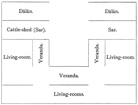 An ordinary Kunbi village26 contains between 70 and 80 houses or some 400 souls. The village generally lies on a slight eminence near a nullah or stream, and is often nicely planted with tamarind or pīpal trees. The houses are now generally tiled for fear of fire, and their red roofs may be seen from a distance forming a little cluster on high lying ground, an elevated site being selected so as to keep the roads fairly dry, as the surface tracks in black-soil country become almost impassable sloughs of mud as soon as the rains have broken. The better houses stand round an old mud fort, a relic of the Pindāri raids, when, on the first alarm of the approach of these marauding bands, the whole population hurried within its walls. The village proprietor’s house is now often built inside the fort. It is an oblong building surrounded by a compound wall of unbaked bricks, and with a gateway through which a cart can drive. Adjoining the entrance on each side are rooms for the reception of guests, in which constables, chuprāssies and others are lodged when they stay at night in the village. Kothas or sheds for keeping cattle and grain stand against the walls, and the dwelling-house is at the back. Substantial tenants have a house like the proprietor’s, of well-laid mud, whitewashed and with tiled roof; but the ordinary cultivator’s house is one-roomed, with an angan or small yard in front and a little space for a garden behind, in which vegetables are grown during the rains. The walls are of bamboo matting plastered over with mud. The married couples sleep inside, the room being partitioned off if there are two or more in the family, and the older persons sleep in the verandahs. In the middle of the village by the biggest temple will be an old pīpal tree, the trunk encircled by an earthen or stone platform, which answers to the village club. The respectable inhabitants will meet here while the lower classes go to the liquor-shop nearly every [43]night to smoke and chat. The blacksmith’s and carpenter’s shops are also places of common resort for the cultivators. Hither they wend in the morning and evening, often taking with them some implement which has to be mended, and stay to talk. The blacksmith in particular is said to be a great gossip, and will often waste much of his customer’s time, plying him for news and retailing it, before he repairs and hands back the tool brought to him. The village is sure to contain two or three little temples of Māroti or Mahādeo. The stones which do duty for the images are daily oiled with butter or ghī, and a miscellaneous store of offerings will accumulate round the buildings. Outside the village will be a temple of Devi or Māta Mai (Smallpox Goddess) with a heap of little earthen horses and a string of hens’ feet and feathers hung up on the wall. The little platforms which are the shrines of the other village gods will be found in the fields or near groves. In the evening the elders often meet at Māroti’s temple and pay their respects to the deity, bowing or prostrating themselves before him. A lamp before the temple is fed by contributions of oil from the women, and is kept burning usually up to midnight. Once a year in the month, of Shrāwan (July) the villagers subscribe and have a feast, the Kunbis eating first and the menial and labouring castes after them. In this month also all the village deities are worshipped by the Joshi or priest and the villagers. In summer the cultivators usually live in their fields, where they erect temporary sheds of bamboo matting roofed with juāri stalks. In these most of the household furniture is stored, while at a little distance in another funnel-shaped erection of bamboo matting is kept the owner’s grain. This system of camping out is mainly adopted for fear of fire in the village, when the cultivator’s whole stock of grain and his household goods might be destroyed in a few minutes without possibility of saving them. The women stay in the village, and the men and boys go there for their midday and evening meals.