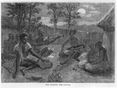 On the 8th, entering Koloa, a considerable town, he observed hanging on a tree a masquerading habit, made of bark, which he was told belonged to Mumbo Jumbo, a sort of wood demon, held greatly in awe, especially by the female part of the community. This strange bugbear is common to all the Mandingo towns, and much employed by the pagan negroes in keeping their women in subjection. As the Kaffirs, or pagan Africans, are not restricted in the number of their wives, every one marries as many as he can conveniently maintain; and it frequently happens that the ladies disagree among themselves, their quarrels sometimes reaching to such a height that the authority of the husband can no longer preserve peace in his household,—in such cases the interposition of Mumbo Jumbo is called in and is always decisive. This strange minister of justice, who is supposed to be either the husband or some person instructed by him, disguised in the dress which has just been mentioned, and armed with the rod of public authority, announces his coming by loud and dismal screams in the woods near the town.