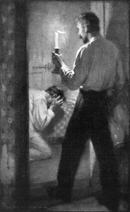 It was a blustery December night when he climbed the hill, and he had to pause several times during the ascent to gain sufficient breath to proceed. By the time he reached the house he was quite speechless, and he dropped on the steps to rest a moment before knocking. As he sat [p318] there trying to imagine the flying-machine or torpedo-boat upon which he felt certain Mr. Opp was engaged, he became aware of voices from within, and looking up, he saw the window above him was slightly raised. Overcome by his desire to see his friend at work upon his great invention, he cautiously tiptoed across the porch and peeped in.