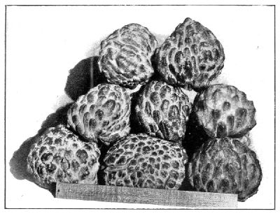 The cherimoya is the best of the custard apples. The tree is a strong grower, with large handsome leaves, but, as a rule, it is not a very heavy bearer. There are many varieties, the fruit of which varies considerably in size and shape, and the skin is sometimes smooth and sometimes warted, or even covered with short soft spines. It has usually comparatively few seeds, and these are surrounded by a rich custard-like pulp, which in the better kinds is of very fine flavour, and is generally much liked. The fruit is not a good keeper, still, given careful handling and packing, it can be kept for nearly a week. All custard apples are easily raised from seed, but the better varieties are propagated by grafting strong seedlings with wood taken from a tree producing fruit of especial merit. Any good fruit soil will grow them, and they do not require any especial treatment.