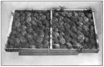 Like the banana, the pineapple is a tropical fruit, and is very sensitive to cold, hence its culture is confined to frostless districts. It is grown all along our eastern seaboard, where, when planted in suitable soils and under suitable conditions, it is, undoubtedly, our hardiest fruit, and is practically immune from any serious disease. Its culture is entirely in the open, no shelter whatever being given, so that we are not put to the great expense that growers of this fruit in Florida and some other pineapple-producing countries must incur if they wish to secure a crop. Here we have no severe freeze-outs, and, though dry spells retard the growth at times, we have never suffered any serious injury from this cause. In the Southern part of the State, the coolness of the winter retards growth somewhat, and occasionally the tops of the leaves and young fruit are slightly injured, particularly in low-lying land, or where the plants are growing on land having a cold subsoil. When grown under more favourable conditions, however, they sustain no injury, and produce fruit, more or less, all the year round. Pines are always in season, though there are times when they are comparatively scarce. There are usually two main crops a year—viz., a summer and a winter crop. The former is the heavier of the two, and the fruit is decidedly the best, as its sugar contents are much higher. The main summer crop ripens in the North from the beginning of November, and in the South from January to as late as March in some seasons. The main winter crop is usually at its best in July and August, but there is always more or less fruit during the other months of the year. The pineapple likes a warm, free, well-drained soil, that is free from frost in winter, and that will not become soured by heavy rain during summer. Sandy loams are, therefore, our best pineapple soils, though it does well on free loams of basaltic or alluvial origin. Unlike the banana, the pineapple does not do too well in newly burnt off scrub land, owing to the difficulty in working the ground and keeping it clean. It requires a thorough preparation of the soil prior to planting in order to be grown to perfection. In the case of new land of suitable texture, the timber should all be burnt off, and all stumps and roots taken out of the soil, which should then be carefully broken up and reduced to a fine tilth, all weed or grass growth being destroyed. It should then be again ploughed, and, if possible, subsoiled, so as to permit of the roots penetrating the ground to a fair depth instead of their merely depending on the few top inches of surface soil. Careful preparation of the land and deep stirring prior to planting will be found to pay well, and turn out far the cheapest in the end. Given suitable soil, well prepared, the growing of pineapples is not at all difficult, as the plants soon take root, and once they became established, they prove themselves to be extremely hardy. Pines will grow and thrive on comparatively poor soil, provided it is of suitable texture, but in such soils it is necessary to supplement the plant food in the soil by the addition of manures, if large fruit and heavy crops are to be obtained. Pineapples are propagated by means of suckers coming from the base of fruit-bearing plants, or from smaller suckers, or, as they are termed, robbers or gill sprouts that start from the fruiting stem just at the base of the fruit. They are also sometimes propagated by means of the crown, but this method is usually considered too slow. Well-developed suckers are usually preferred, as these come into bearing earliest, but equally good, if not better, returns are obtained by planting gill sprouts. The latter have the advantage in that they always develop a good root system before showing signs of fruit, hence their first crop is always a good one, and the fruit is of the best, whereas suckers sometimes start flowering as soon as they are planted, before they are properly established, with the result that the first fruit is small and inferior, and the plants have to throw out fresh suckers before a good crop is produced. Gill sprouts are slower in coming into bearing than suckers, but the results are usually more satisfactory. Like the banana, once a pineapple plant has borne fruit the fruiting stalk dies down, and its place is taken by one or more suckers, which in their turn bear fruit and die. Pineapples are planted in Queensland in several ways, but by far the most common method is to set the suckers out in single or double rows, from 8 to 9 feet apart, with the plants at from 1 to 2 feet apart in the row. The rows soon increase in width by the growth of suckers, and the throwing up of ratoons—surface roots thrown off from the original plant, which send up plants from below the ground as distinct from suckers, which come from the base or even higher up the stem of a fruiting plant. It is not at all an uncommon thing to see the rows grown together, so that the plantation appears to be a solid mass of plants, but pathways have to be kept between the rows to permit of gathering the fruit, manuring, &c. Pineapples have been grown in the Brisbane district for the past sixty years, and I have been shown beds of plants that have not been replanted for over forty years that are still producing good fruit. This shows how well at home this fruit is with us; but, in my opinion, it is not desirable to keep the plants so long in the same ground, as the finest fruit is always obtained from comparatively young plantations, the older ones producing too large a proportion of small fruit. From the Brisbane district this fruit has spread all over the eastern coast, and its production is increasing rapidly in several districts. Once the pine is planted, its cultivation is comparatively simple. If in single or double rows, all weed growth is kept down between the plants, and the ground between the rows is kept in a state of good cultivation by means