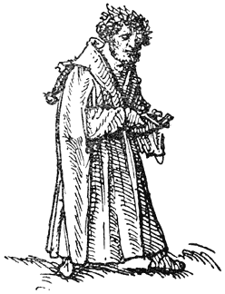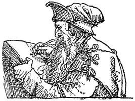Een enkel woord over de in deze uitgave opgenomen penteekeningen van Holbein: Hans Holbein, de jongere, 1497–1543, woonde gedurende de eerste jaren van zijn werkzaamheid in Bazel, waar Erasmus zich met voorliefde placht op te houden en waar hij ook gestorven is. In een exemplaar van “de Lof der Zotheid,” door den Bazelschen drukker Froben in 1514 uitgegeven, dat voor Erasmus persoonlijk bestemd was, heeft Holbein—die met Erasmus op goeden voet stond—op den rand der bladzijden een aantal geestige illustraties aangebracht. Het boek berust thans in het museum van Bazel. Aan dit werk heeft de schilder, zooals uit een aanteekening op een blad van het exemplaar blijkt, slechts tien dagen besteed. En zoo heeft hij natuurlijk niet zorgvuldig gewikt en gewogen, wat van den inhoud meer in het bijzonder in aanmerking kwam [8]om te worden in beeld gebracht, maar slechts de voorstelling, die een woord of zegswijze voor zijn schildersoog deed oprijzen, met losse hand op het papier geworpen. Vandaar, dat de plaatjes2 dikwijls zoo ongelijkmatig zijn verdeeld. Een enkele maal zelfs bekommert Holbein zich in het geheel niet om den tekst, maar illustreert den commentaar van Listrius, die ook in bovengenoemd exemplaar was afgedrukt.
