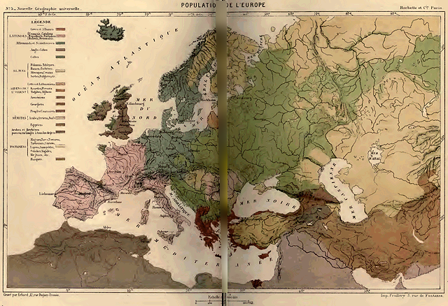 Sans tenir compte des groupes de population d'une importance secondaire, ni des races dont les représentants n'existent pas en corps de nation, on peut dire, d'une manière générale, que l'Europe se partage en trois grands domaines ethniques, ayant précisément pour limites communes ou pour bornes angulaires les massifs des Alpes, des Carpathes, des Balkhans. Ces montagnes, qui séparent les bassins fluviaux et servent de barrière entre les climats, devaient aussi régir en partie la distribution des races.