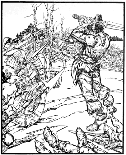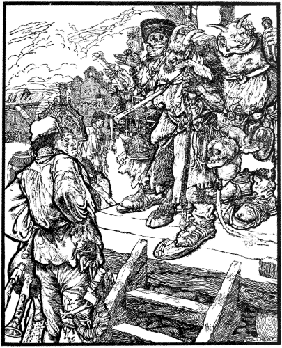So the man thanked the Wind for his good advice, and went on his way. He came to the inn, and when the Jews saw that he brought nothing with him they said, “Hearken, O man! don’t come here, for we have no brandy.”––“What do I want with your brandy?” cried the man in a rage.––“Then for what hast thou come hither?”––“I have come for my own.”––“Thy own,” 39 said the Jews; “what dost thou mean?”––“What do I mean?” roared the man; “why, my sack and my ram, which you must give up to me.”––“What ram? What sack?” said the Jews; “why, thou didst take them away from here thyself.”––“Yes, but you changed them,” said the man.––“What dost thou mean by changed?” whined the Jews; “we will go before the magistrate, and thou shalt hear from us about this.”––“You will have an evil time of it if you go before the magistrate,” said the man; “but at any rate, give me back my own.” And he sat down upon a bench. Then the Jews caught him by the shoulders to cast him out and cried, “Be off, thou rascal! Does any one know where this man comes from? No doubt he is an evil-doer.” The man could not stand this, so he cried, “Out of the drum, my henchmen! and give the accursed Jews a sound drubbing, that they may know better than to take in honest folk!” and immediately the twelve henchmen leaped out of the drum and began thwacking the Jews finely.––“Oh, oh!” roared the Jews; “oh, dear, darling, good man, we’ll give thee whatever thou dost want, only leave off beating us! Let us live a bit longer in the world, and we will give thee back everything.”––“Good!” said the man, “and another time you’ll know better than to deceive people.” Then he cried, “Into the drum, my henchmen!” and the henchmen disappeared, leaving the Jews more dead than alive. Then they gave the man his sack and his ram, and he went home, but it was a long, long time before the Jews forgot those henchmen.