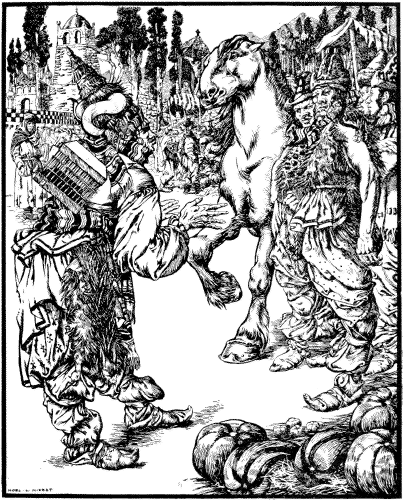 “How shall we manage to live with so little?” said the father.––“Wait a while, dad, and we shall have still more,” said the son. “When we pass through the fair I’ll change myself into a horse, and thou must sell 23 me. They will give thee a thousand roubles for me, only sell me without a halter.” So when they got to the next little town, where they were holding a fair, the son changed himself into a horse, a horse as supple as a serpent, and so fiery that it was dangerous to approach him. The father led the horse along by the halter; it pranced about and struck sparks from the ground with its hoofs. Then the horse-dealers came together and began to bargain for it. “A thousand roubles down,” said he, “and you may have it, but without the halter.”––“What do we want with thy halter? We will make for it a silver-gilt halter. Come, we’ll give thee five hundred!”––“No!” said he. Then up there came a gipsy, blind of one eye. “O man! what dost thou want for that horse?” said he.––“A thousand roubles without the halter.”––“Nay! but that is dear, little father! Wilt thou not take five hundred with the halter?”––“No, not a bit of it!”––“Take six hundred, then!” Then the gipsy began higgling and haggling, but the man would not give way. “Come, sell it,” said he, “with the halter.”––“No, thou gipsy, I have a liking for that halter.”––“But, my good man, when didst thou ever see them sell a horse without a halter? How then can one lead him off?”––“Nevertheless, the halter must remain mine.”––“Look now, my father, I’ll give thee five roubles extra, only I must have the halter.”––The old man fell a-thinking. “A halter of this kind is worth but three grivni[4] and the gipsy offers me five roubles for it; let him have it.” So they clinched the bargain with a good drink, and the old man went home with the money, and the gipsy walked off 24 with the horse. But it was not really a gipsy, but Oh, who had taken the shape of a gipsy.