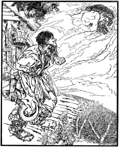 When he got to his house, he cried, “Open the door, wife!” Then his wife opened the door, and he went in and hung his sack on the peg and said, “Sit down at the table, dear wife, and you children sit down there too. Now, thank God! we shall have enough to eat and drink, and to spare.” The wife looked at her husband and smiled. She thought he was mad, but down she sat, and her children sat down all round her, and she waited to see what her husband would do next. Then the man said, “Sack, sack, give to us meat and drink!” But the sack was silent. Then he said again, “Sack, sack, give my children something to eat!” And still the sack was silent. Then the man fell into a violent rage. “Thou didst give me something at the tavern,” cried he; “and now I may call in vain. Thou givest nothing, and thou hearest nothing”––and, leaping from his seat, he took up a club and began beating the sack till he had knocked a hole in the wall, and beaten the sack to bits. Then he set off to seek the Wind again. But his wife stayed at home and put everything to rights again, railing and scolding at her husband as a madman.
