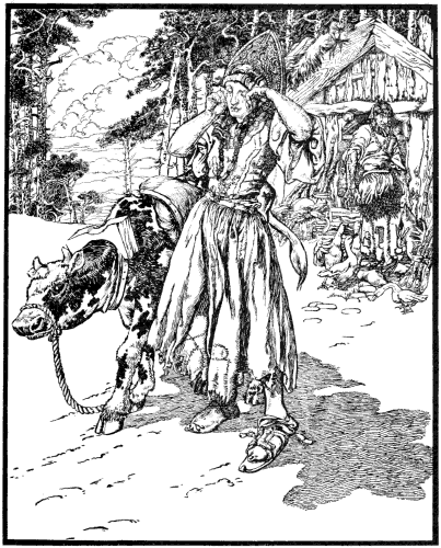 Once upon a time, long long ago, beyond the times that we can call to mind, ere yet our great-grandfathers or their grandfathers had been born into the world, there lived a poor man and his wife, and they had one only son, who was not as an only son ought to be to his old father and mother. So idle and lazy was that only son that Heaven help him! He would do nothing, he would not even fetch water from the well, but lay on the stove all day long and rolled among the warm cinders. If they gave him anything to eat, he ate it; and if they didn’t give him anything to eat, he did without. His father and mother fretted sorely because of him, and said, “What are we to do with thee, O son? for thou art good for nothing. Other people’s children are a stay and a support to their parents, but thou art but a fool and dost consume our bread for naught.” But it was of no use at all. He would do nothing but sit on the stove and play with the cinders. So his father and mother grieved over him for many a long day, and at last his mother said to his father, “What is to be done with our son? Thou dost see that he has grown up and 16 yet is of no use to us, and he is so foolish that we can do nothing with him. Look now, if we can send him away, let us send him away; if we can hire him out, let us hire him out; perchance other folk may be able to do more with him than we can.” So his father and mother laid their heads together, and sent him to a tailor’s to learn tailoring. There he remained three days, but then he ran away home, climbed up on the stove, and again began playing with the cinders. His father then gave him a sound drubbing and sent him to a cobbler’s to learn cobbling, but again he ran away home. His father gave him another drubbing and sent him to a blacksmith to learn smith’s work. But there too he did not remain long, but ran away home again, so what was that poor father to do? “I’ll tell thee what I’ll do with thee, thou son of a dog!” said he. “I’ll take thee, thou lazy lout, into another kingdom. There, perchance, they will be able to teach thee better than they can here, and it will be too far for thee to run home.” So he took him and set out on his journey.