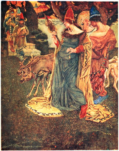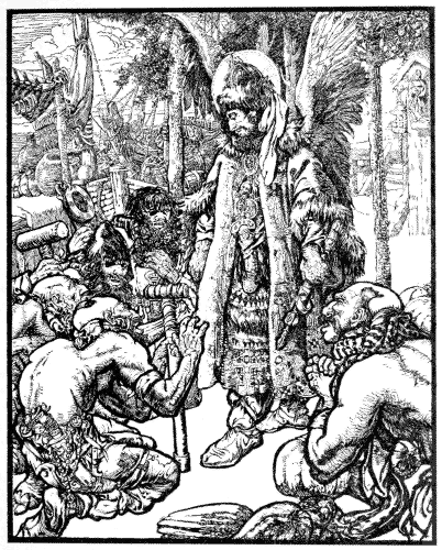 About the same time they told the Tsar that a certain merchant had come to the palace. It was Oh, who had changed himself into a merchant. The Tsar went out to him and said, “What dost thou want, old man?”––“I was sailing on the sea in my ship,” said Oh, “and carrying to the Tsar of my own land a precious garnet ring, and this ring I dropped into the water. Has any of thy servants perchance found this precious ring?”––“No, but my daughter has,” said the Tsar. So they called the damsel, and Oh began to beg her to give it back to him, “for I may not live in this world if I bring not the ring,” said he. But it was of no avail, she would not give it up.
