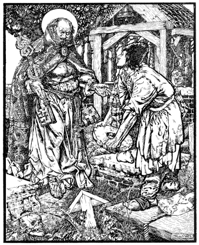 He had not gone very far when he passed by a tavern, and he felt a burning desire to find out whether the Wind had spoken the truth in the matter of the sack. “How can a man pass a tavern without going into it?” thought he; “I’ll go in, come what may. 32 The Wind won’t know, because he can’t see.” So he went into the tavern and hung up his sack upon a peg. The Jew who kept the tavern immediately said to him, “What dost thou want, good man?”––“What is that to thee, thou dog?” said the man.––“You are all alike,” sneered the Jew, “take what you can, and pay for nothing.”––“Dost think I want to buy anything from thee?” shrieked the man; then, turning angrily to the sack, he cried, “Sack, sack, give me to eat and drink!” Immediately the table was covered with all sorts of meats and liquors. Then all the Jews in the tavern crowded round full of amazement, and asked all manner of questions. “Why, what is this, good man?” said they; “never have we seen anything like this before!”––“Ask no questions, ye accursed Jews!” cried the man, “but sit down to eat, for there is enough for all.” So the Jews and the Jewesses set to and ate until they were full up to the ears; and they drank the man’s health in pitchers of wine of every sort, and said, “Drink, good man, and spare not, and when thou hast drunk thy fill thou shalt lodge with us this night. We’ll make ready a bed for thee. None shall vex thee. Come now, eat and drink whatever thy soul desires.” So the Jews flattered him with devilish cunning, and almost forced the wine-jars to his lips.