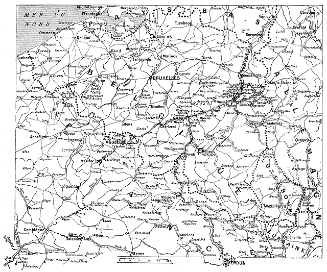 Aujourd'hui le théâtre des opérations s'étend sur quatre régions naturelles différentes. A l'extrême gauche, sur la rive gauche de la Meuse, c'est le Brabant, le Limbourg et l'Hesbaye, pays de plaines accidentées de vallonnements; puis vient l'Ardenne, un bloc de plateaux doucement incliné vers le Nord-Ouest, relevé au contraire du côté de la France, pays de forêts et de marais; plus loin, en avant de Nancy, le plateau de Lorraine, région de plaines boisées, sillonnée de rivières et d'étangs; s'appuyant au Donon, enfin, la crête des Vosges sur laquelle nous nous maintenons et d'où nous pourrons redescendre en Alsace.CHARLES RABOT.