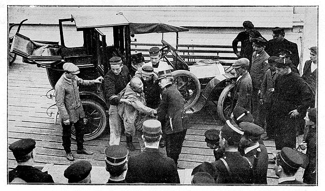 LE CONTRASTE.--Un soldat allemand blessé est descendu avec d'infinies précautions de l'automobile qui l'a amené à Ostende.
