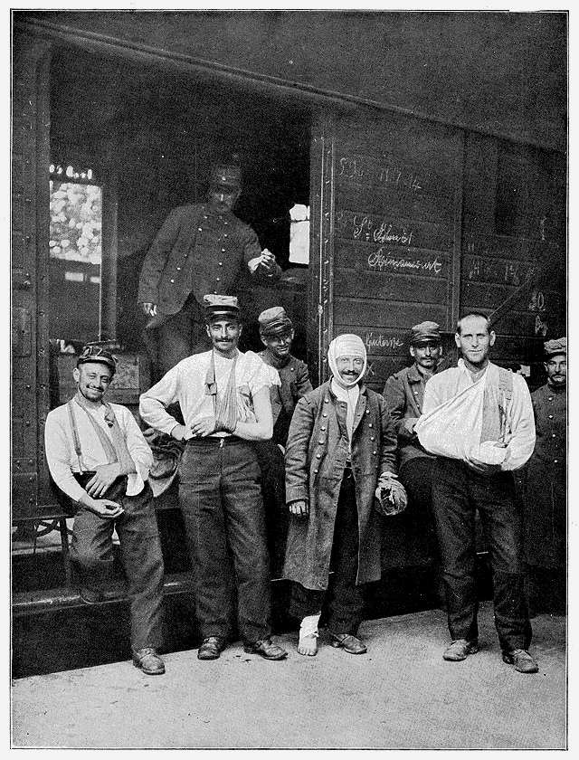 Dans cette atmosphère d'ardeur et de foi où nous vivons, il est un fait qui a fortement contribué à nous affermir dans notre confiance: c'est l'état moral où nous avons vu, toujours et partout, nos blessés. Tous ont été touchés en face. Ils en sont fiers. Et si quelques-uns laissaient paraître sur leur visage une ombre d'inquiétude ou de crainte, ce seraient ceux qui redoutent de ne pouvoir être guéris assez tôt pour retourner au front. Le photographe peut se camper devant n'importe lequel des trains qui les ramènent, viser le premier groupe qui s'offre à son objectif; la formule habituelle de l'opérateur est ici superflue: ils sourient sans qu'on le leur dise.