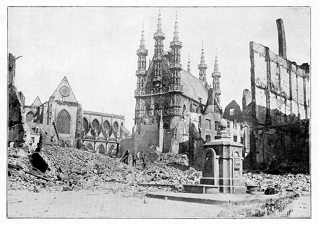 De Louvain, il ne subsiste plus que l'Hôtel de Ville et l'église Sainte-Gertrude, les deux témoins les plus magnifiques de l'ancienne cité. Dominant ce champ de cendres et de décombres, ces deux témoins-là, nés du génie de la paix, contemplent ce que le «génie» d'une bande de vandales a pu accomplir entre un coucher et un lever de soleil. L'Ecole des Arts et Manufactures, l'Ecole d'Agriculture, l'Université, tout a été détruit. De toutes ces forteresses pacifiques, ce sont les 100.000 volumes et les manuscrits de la Bibliothèque qui ont résisté le plus longtemps à la rage des incendiaires. La pensée humaine, qu'on avait accumulée là depuis plus de cinq siècles, s'est défendue rayon par rayon, livre par livre, jusqu'à ce que les bidons d'essence triomphent de leur entêtement.