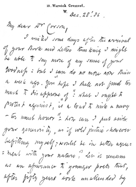 | “Asolando”—Last Days in DeVere Gardens—Letters of Browning and Tennyson—Venetian Lingerings and Friends—Mrs. Bronson’s Choice Circle—Browning’s Letters to Mrs. Bronson—Asolo—“In Ruby, Emerald, Chrysopras”—Last Meeting of Browning and Story—In Palazzo Rezzonico—Last Meeting with Dr. Corson—Honored by Westminster Abbey—A Cross of Violets—Choral Music to Mrs. Browning’s Poem, “The Sleep”—“And with God Be the Rest!” | 269 |