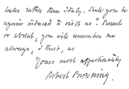The present volume was initiated in Florence, and, from its first inception, invested with the cordial assent and the sympathetic encouragement of Robert Barrett Browning. One never-to-be-forgotten day, all ethereal light and loveliness, has left its picture in memory, when, in company with Mr. Browning and his life-long friend, the Marchesa Peruzzi di’ Medici (náta Story), the writer of this biography strolled with them under the host’s orange trees and among the riotous roses of his Florentine villa, “La Torre All’ Antella,” listening to their sparkling conversation, replete with fascinating reminiscences. To Mr. Browning the tribute of thanks, whose full scope is known to the Recording Angel alone, is here offered; and there is the blending of both privilege and duty in grateful acknowledgements to Messrs. Smith, Elder, & Company for their courtesy in permitting the somewhat liberal drawing on their published Letters of both the Brownings, on which reliance had to be based in any effort to