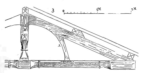 Nous voyons quelques tentatives de ce genre faites dans de petits édifices de la Guienne qui datent du XIIe siècle. Nous donnons (3) une de ces charpentes, provenant de l'église de Lagorce près Blaye 1. L'entrait est façonné, chanfreiné sur ses arêtes. Les chanfreins s'arrêtent au droit des assemblages pour laisser toute la force du bois là où un tenon vient s'assembler dans une mortaise. Les jambettes A sont taillées sur une courbe formant, avec la partie supérieure des deux arbalétriers, un demi-cercle complet. Le poinçon B reçoit des entre-toises C qui soulagent le faîtage D au moyen de liens inclinés. Ces liens empêchent le dévers des fermes et contribuent à les maintenir dans un plan vertical; les arbalétriers portaient des pannes. Cette charpente demandait encore, par conséquent, comme celle donnée fig. 2, des murs fort épais pour éviter les porte-à-faux. On évita bientôt cet inconvénient en assemblant les pannes dans l'arbalétrier même, au lieu de les poser au-dessus; on gagnait ainsi toute l'épaisseur de la panne, et même, en les assemblant de plat et en contrebas de l'affleurement extérieur de l'arbalétrier, on se réserva la place du chevron qui, alors, ne dépassait pas le plan incliné passant par la face externe de ces arbalétriers.