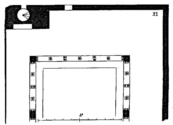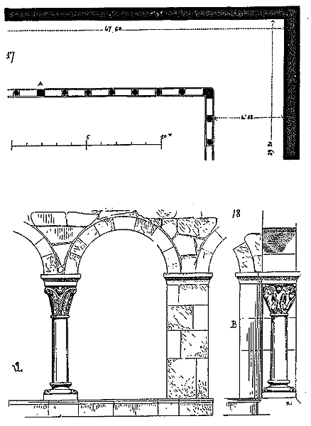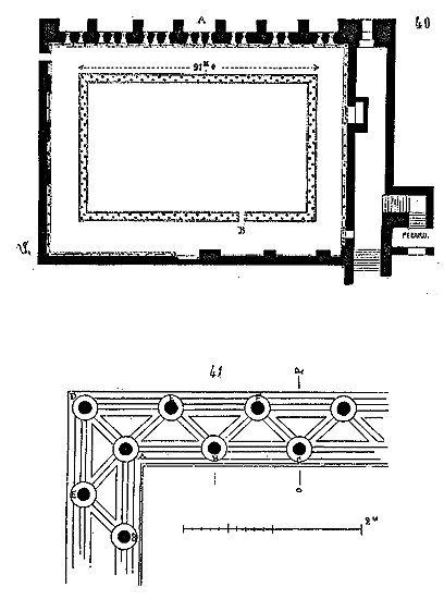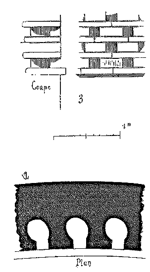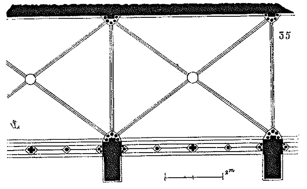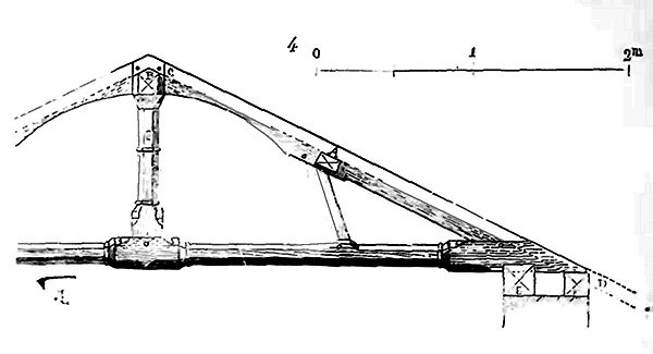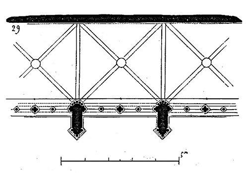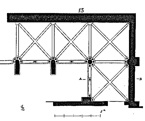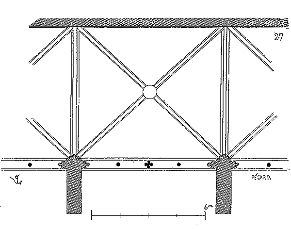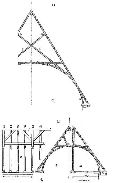 Sur l'une des salles beaucoup plus petite, du même édifice, nous trouvons encore une charpente dont la combinaison, aussi bien entendue que simple, doit nous arrêter. Cette salle n'a pas plus de 4m,80 de largeur; elle était, de même que la grande, couverte par un berceau plein-cintre en charpente avec entraits et poinçons apparents. Nous donnons (21) cet exemple.