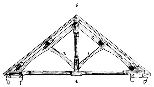 Il nous faut distinguer les charpentes de combles (puisque c'est de celles-ci que nous nous occupons d'abord) en charpentes destinées à couvrir des voûtes et en charpentes apparentes. Les premières n'ont qu'une fonction utile n'étant pas vues de l'intérieur des édifices; elles doivent, par conséquent, tout sacrifier à la solidité. Les secondes supportent la couverture en plomb, en ardoise ou en tuile, et deviennent un moyen de décoration intérieure.