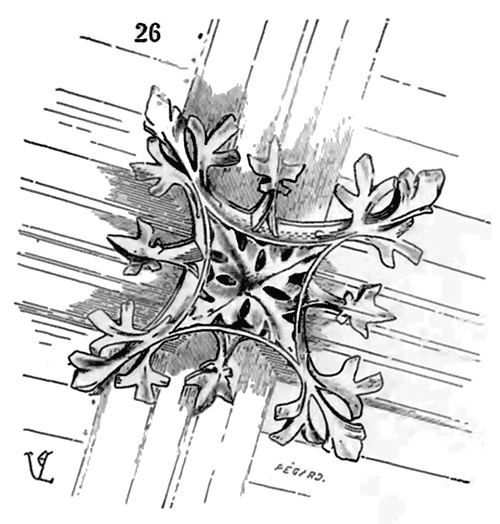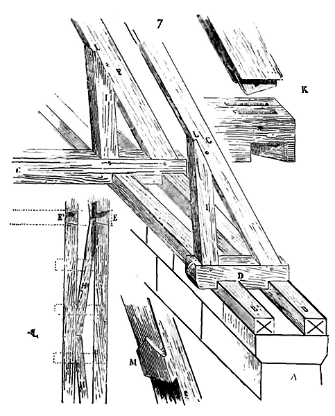 Il n'y a pas ici de fermes-maîtresses; la charpente consiste en une série de chevrons portant ferme, sans poinçons; mais tout le système est rendu solidaire (voy. fig. 27) par deux entre-toises K raidies par une succession de croix de Saint-André L et par de grandes écharpes croisées M assemblées à tiers-bois en dehors du chevronnage suivant sa pente. Ce sont surtout ces écharpes croisées, prises dans le plan des chevrons, qui maintiennent le roulement de la charpente. Des fourrures posées sur les chevrons rachètent la saillie que forment ces écharpes croisées sur le plan incliné du chevronnage et reçoivent la volige et l'ardoise. Les chevrons sont espacés de 0,63 c. d'axe en axe, et la volige est, par conséquent, très-épaisse, en chêne refendu. Les têtes des chevrons s'assemblent à mi-bois et ne portent pas sur un sous-faîte.