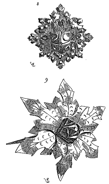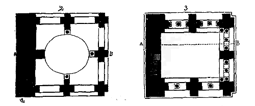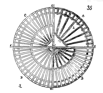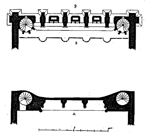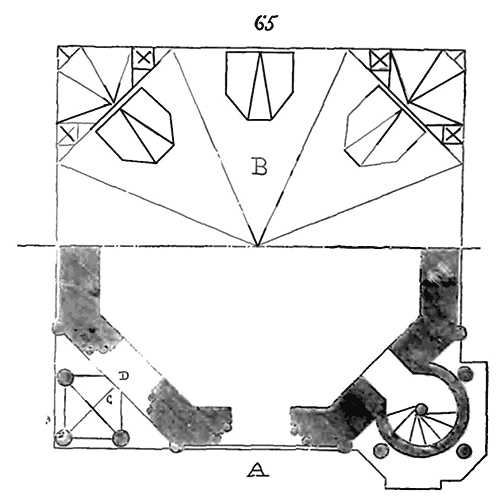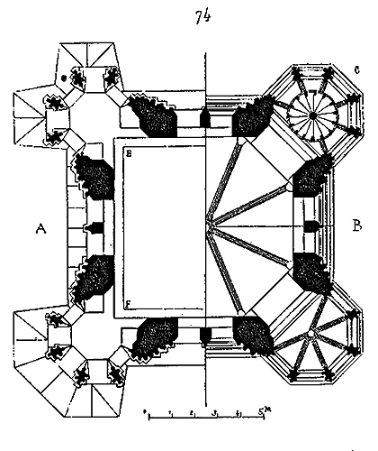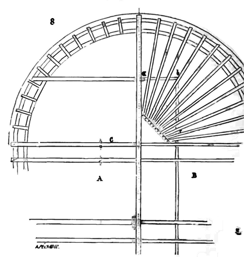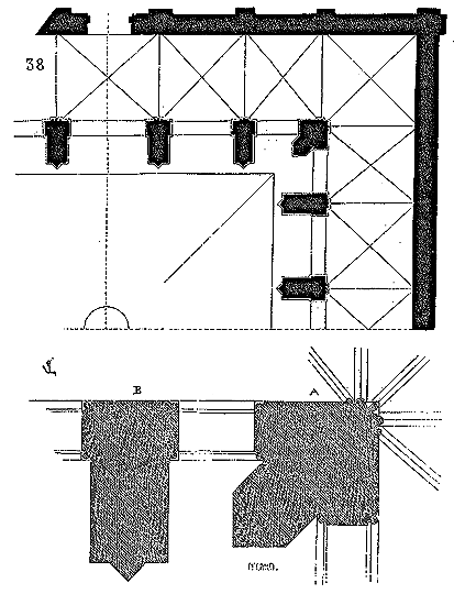 Prenons donc comme exemple d'une des charpentes de combles les plus anciennes, celle du choeur de Notre-Dame de Paris; nous aurons ainsi, dans un petit nombre de figures, des fermes ordinaires, des chevrons portant fermes et une croupe. La fig. 8 donne le plan de la croupe qui couvre le chevet. Les fermes-maîtresses sont accouplées. Le côté A du plan présente la projection horizontale des sablières et des entraits au-dessus du bahut; le côté B, la projection horizontale de la première enrayure.