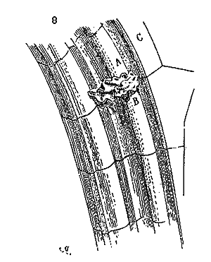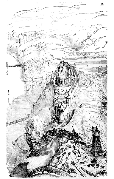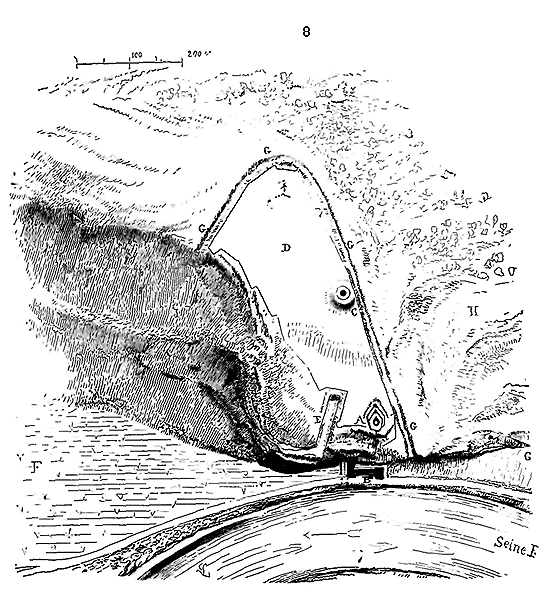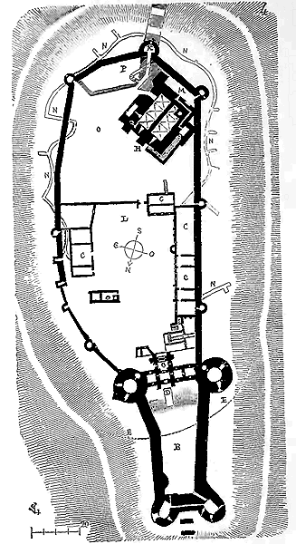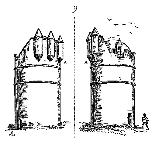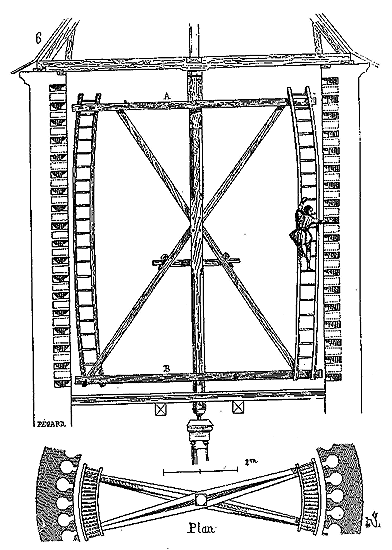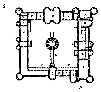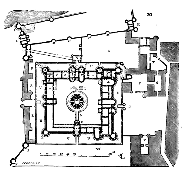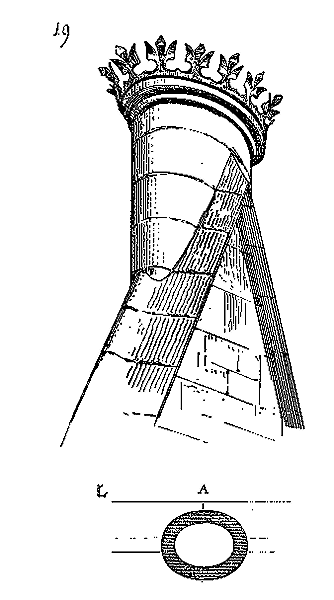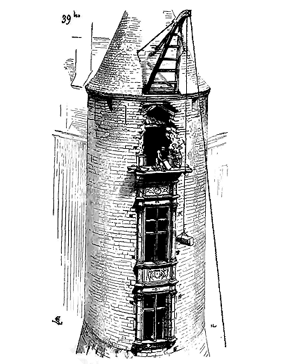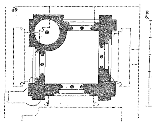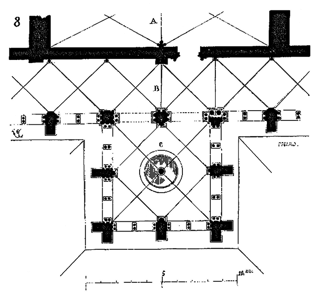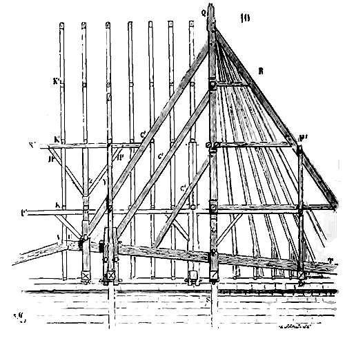 La pièce inclinée T U est, de plus, suspendue au poinçon Q et aux deux faux poinçons Y Z par de fortes moises et des clefs. C'est sur cette pièce inclinée T U, qui est par le fait un arbalétrier très-résistant, que viennent s'assembler les trois contre-fiches C' destinées à contrebuter la poussée des chevrons de croupe et à maintenir la ferme-maîtresse dans son plan vertical Q S. Les autres parties de cette charpente n'ont pas besoin de longues explications pour être comprises. Les sablières circulaires de la croupe sont maintenues par un entrait D' suspendu par une paire de moises F' au chevron d'axe qui est doublé et remplit les fonctions d'un arbalétrier, car il s'assemble sur l'extrémité de la pièce inclinée T U. Cet entrait porte un châssis a b c (fig. 8) destiné à soulager la première enrayure. Le roulement de toute la charpente est évité par les liens H (fig. 10) qui s'assemblent dans les entre-toises d'axes horizontales posées sous la seconde enrayure et dans les poinçons des fermes. Le voligeage en chêne maintient les chevrons dans leur plan vertical, cette charpente étant, comme toutes les charpentes de cette époque, dépourvue de faîtage et de pannes. Le fléchissement des chevrons est évité au moyen des entraits retroussés K' qui sont soulagés par les entre-toises d'axe R', et les doubles entre-toises P' s'assemblent dans les moises pendantes N de la fig. 9.