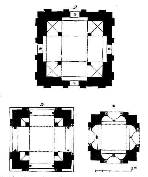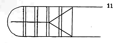 La fig. 10 donne la coupe du comble suivant l'axe longitudinal du chevet. Q est la ferme-maîtresse dont la fig. 9 donne l'élévation; en R sont tous les chevrons de croupe qui viennent buter contre son sommet. Afin de la maintenir dans le plan vertical Q S, les charpentiers posèrent les grandes pièces inclinées T U, V X. La première vient s'asseoir sur les sablières en T, se réunit à la seconde par une coupe en V. La seconde s'assemble à l'extrémité du poinçon de la cinquième ferme-maîtresse, et de ce point deux pièces verticales, posées en forme de V, vont reporter la poussée à une assez grande distance sur les bouts d'un entrait, afin d'éviter l'écartement des branches de ce V, ainsi que l'indique la fig. 11.