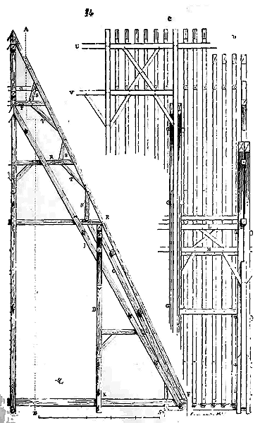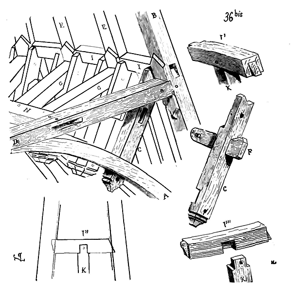 À la fin du XIVe siècle et au commencement du XVe, l'Angleterre était victorieuse, riche et florissante; la France, au contraire, était ruinée par des invasions désastreuses et les querelles des grands vassaux de la couronne; aussi n'avons-nous rien, à cette époque, qui puisse être comparé à la grand'salle de l'abbaye de Westminster comme luxe de construction. Les charpentes qui nous sont restées de ce temps sont simples et ne diffèrent guère de celles données ci-dessus fig. 19, 21, 23, 26, 28, car elles ne couvrent généralement que des salles d'une médiocre largeur. Si la Normandie ou la Picardie ont possédé des charpentes de combles élevées conformément au système anglo-normand, ce qui est possible, elles ne sont pas parvenues jusqu'à nos jours. Nous trouvons cependant, près de Maubeuge, dans la petite église de Hargnies (Nord), une charpente dont la combinaison se rattache aux deux systèmes anglo-normand et français. Cette charpente est, ou plutôt était dépourvue d'entraits, car, vers le milieu du XVIe siècle, des tirants furent posés de deux en deux fermes sous les arbalétriers. Les fermes-maîtresses, dont nous donnons le profil en A (34 bis), reposent sur de forts blochets B; elles se composent de deux courbes C s'assemblant à l'extrémité inférieure du poinçon D, d'arbalétriers E courbes eux-mêmes à leur point de rencontre avec le poinçon, afin de trouver des assemblages solides indiqués dans le détail M. La courbe et l'arbalétrier sont bridés à la tangente, au moyen de deux petites moises F dont le détail N explique la forme et les attaches. Sous les arbalétriers sont chevillés et assemblés à mi-bois deux cours d'entre-toises ou pannes G dans lesquelles viennent s'assembler des croix de Saint-André inclinées suivant la pente du chevronnage, et figurés en I dans la coupe longitudinale. Ces pannes soulagent le chevronnage profilé en P, mais ont pour but principal d'empêcher le hiement de la charpente. Le chevronnage est muni également de courbes sous lesquelles sont cloués les bardeaux, ainsi qu'on le voit en H. Le sous-faîte K et les entre-toises L sont réunis par des croix de Saint-André qui maintiennent les poinçons verticaux.