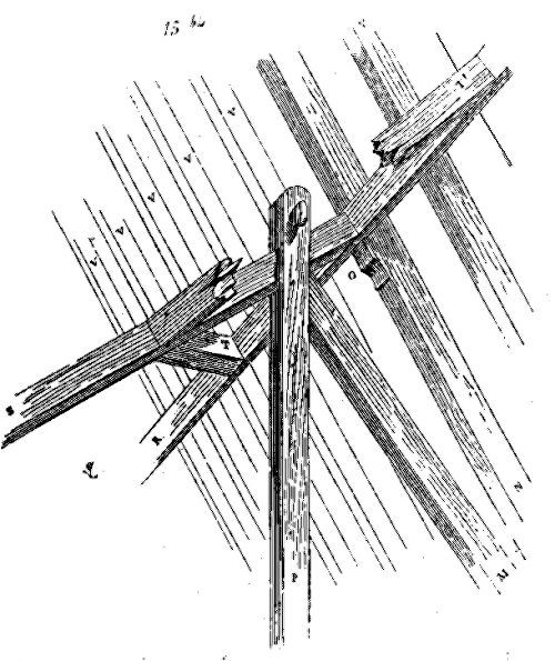 Voici (15 bis) un détail perspectif de l'assemblage des contre-fiches avec le cours de pannes inférieur. En M est figurée la jambe de force; en N l'arbalétrier avec son renfort O destiné à arrêter la panne R; en S la contre-fiche avec ses deux grands goussets TT'; le gousset T' est supposé brisé pour laisser voir la tête des moises pendantes avec sa clef de bois au-dessus de l'assemblage de la jambe de force dans la contre-fiche; en V sont les chevrons. On rencontre un assez grand nombre de charpentes de comble, de la fin du XVe siècle et du commencement du XVIe, tracées et taillées suivant ce système, qui est excellent et n'exige en oeuvre que peu de bois. La charpente de la cathédrale d'Amiens entre autres, refaite au commencement du XVIe siècle, est armée de pannes ainsi maintenues rigides au moyen de goussets assemblés dans les contre-fiches perpendiculaires aux arbalétriers. Quelquefois, dans de très-grandes charpentes, les contre-fiches reçoivent non-seulement les goussets qui maintiennent les pannes rigides, mais encore des esseliers et des liens qui soulagent l'arbalétrier, ainsi que l'indique la fig. 16.