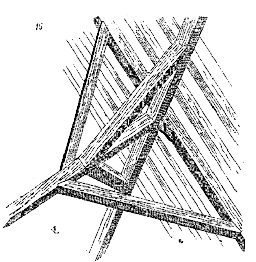 chevrons assemblés à mi-bois et maintenus par des chevilles. Ce