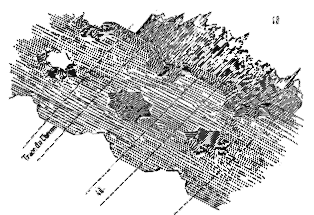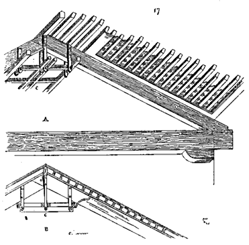 Les entraits ont 14m,00 de portée; grâce à leur énorme équarrissage (0,80 c. sur 0,45 c.), ils n'ont pas fléchi d'une manière sensible. Ils sont soulagés sous les portées par des corbeaux. Les arbalétriers, assemblés à la tête à mi-bois et chevillés, sont maintenus en outre chacun dans leur plan par le poids du petit plafond C suspendu à des moises pendantes. Afin d'éviter l'épaisseur des pannes et du chevronnage qui eût obligé de donner une grande épaisseur aux murs, ainsi que nous l'avons démontré au commencement de cet article, les charpentiers ont supprimé les pannes et ont posé les chevrons en travers sur les arbalétriers, comme le démontre notre fig. 17 A perspective et B géométrale d'une ferme avec les chevrons et le plafond sous-faîte. Dès lors ce chevronnage, ou plutôt cette série de petites pannes, n'avait plus qu'à recevoir la volige en long. Mais pour éviter les fissures qui n'eussent pas manqué de laisser pénétrer le vent sous la tuile entre ces voliges, celles-ci ont été doublées, ainsi que l'indique la fig. 18, celles du dessous étant ajourées, entre chaque panne, par des étoiles; toutefois, malgré cet ajour qui devenait un joli motif de décoration, tous les joints sont couverts, et l'air ne peut pénétrer à l'intérieur.