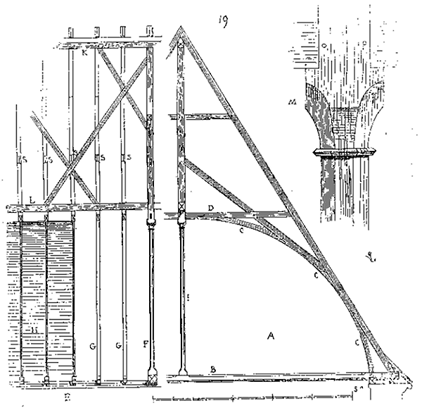 En A (19), nous présentons l'une des fermes; entre l'entrait B et l'entrait retroussé D, on voit une suite de courbes C habilement assemblées qui sont destinées à recevoir les bardeaux ou feuillets de chêne qui forment un berceau plein-cintre légèrement surbaissé; en I est le poinçon qui passe à travers le berceau, au droit de chaque ferme, et vient suspendre l'entrait. La coupe longitudinale E montre une ferme en F et une suite de chevrons portant ferme G. Tous les chevrons sont armés chacun d'un entrait retroussé avec des courbes absolument semblables à celles C de la ferme-maîtresse. Les bardeaux en bois refendus sont cloués sur chaque courbe des chevrons et des fermes, ainsi qu'on le voit en H, et des couvre-joints, moulurés viennent cacher les joints et renforcer encore les courbes à l'intérieur, en même temps qu'ils servent de décoration. De grandes croix de Saint-André, assemblées dans les poinçons, dans les sous-faîtes K et entre-toises L, empêchent le hiement de l'ensemble de la charpente et le déversement des fermes. Nous donnons en M un détail du chapiteau du poinçon au point où il commence à devenir apparent sous le berceau. Cette charpente est aussi légère que solide, et il est facile de reconnaître qu'on n'y a mis en oeuvre que la quantité de bois rigoureusement nécessaire à sa stabilité. Les équarrissages sont réduits à leur plus faible volume. Dans sa partie vue, le poinçon ne donne, en section horizontale, qu'un octogone de 0,13 centimètres de diamètre; les arbalétriers n'ont que 0,14 c. sur 0,12 c. d'équarrissage, les chevrons 0,13 c. sur 0,12 c. Mais la façon dont les chevrons portant ferme sont rendus rigides mérite particulièrement de fixer l'attention des constructeurs.