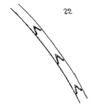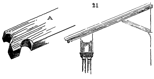 En A est la ferme-maîtresse, en B un des chevrons portant ferme, et en C la coupe longitudinale de la charpente. Comme toujours, des bardeaux en chêne avec couvre-joints étaient cloués sur les courbes des fermes et chevrons. Ces bardeaux ou feuillets de chêne refendu ont ordinairement 0,01 c. d'épaisseur, et même quelquefois 0,009 m. Ceux de la grande charpente (fig. 19) n'ont pas davantage; ils sont assemblés à grain d'orge, ainsi que l'indique la fig. 22, afin d'empêcher le vent qui passe sous la tuile de pénétrer à l'intérieur. Mais le berceau apparent de ces sortes de charpente n'adopte pas toujours la forme plein-cintre; il n'est quelquefois qu'un segment de cercle et plus souvent en tiers-point.