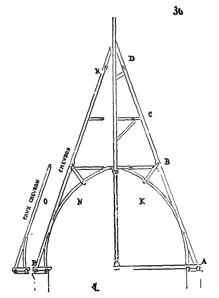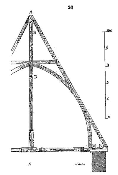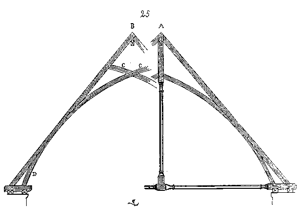Cependant les charpentiers des XIIIe et XIVe siècles élevaient des charpentes apparentes encore plus simples que celles données ci-dessus, pour couvrir des vaisseaux d'une largeur de 7m,00 à 8m,00. Il en existe une encore au-dessus de la nef de la petite église de Saint-Jean de Châlons-sur-Marne, qui se recommande par son extrême légèreté. Nons donnons (25) une des fermes-maîtresses de cette charpente, en A et en B un des chevrons. Ceux-ci ne sont rendus rigides que par les deux contre-fiches croisées C C et les jambettes D. Ici le berceau en tiers-point se compose de deux segments de cercle dont le centre est posé en contrebas de l'entrait.