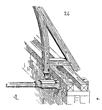 Telle est la charpente apparente de l'église de Mauvesin près Marmande 8 que nous donnons (23). Nous choisissons celle-ci, entre beaucoup d'autres, à cause de la disposition particulière des sablières, qui sont posées sur les entraits au lieu d'être au-dessous, et des blochets C qui viennent s'assembler dans les jambettes D, lesquelles sont pendantes et terminées par un cul-de-lampe, ainsi que le démontre la fig. 24. Les chevrons E, étant eux-mêmes assemblés à l'extrémité des blochets, débordent l'arête extérieure de la tête du mur, et tiennent lieu des coyaux destinés ordinairement à supporter l'égout du toit lorsque celui-ci, comme dans le cas présent, n'a pas de chéneau.