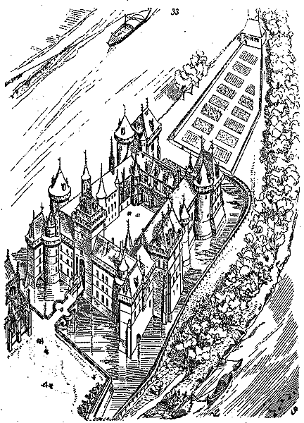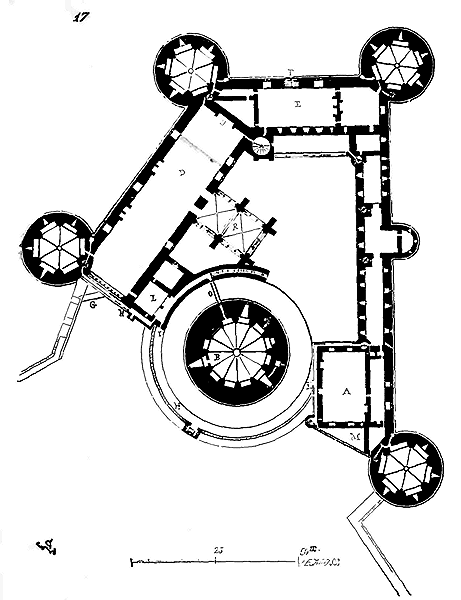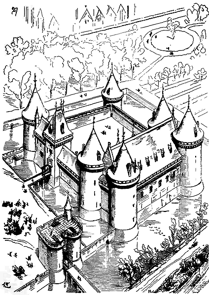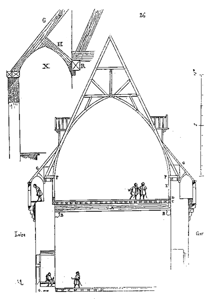 Parmi ces restes de l'art de la charpenterie du moyen âge, l'un des plus intéressants, des plus anciens et des plus complets, est la charpente de la grand'salle du château de Sully-sur-Loire, qui date de la fin du XIVe siècle. La grand'salle du château de Sully est située au troisième étage, à 14m,30 au-dessus du sol de la cour; c'est tout un système de construction de bois, admirablement entendu, qui couronne un long et large bâtiment fortifié, défendu par des machicoulis avec chemin de ronde, du côté extérieur donnant sur la Loire et du côté de la cour.