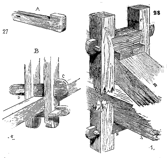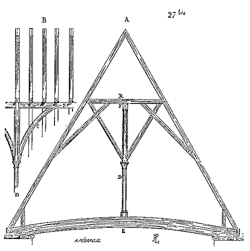 Nous donnons (27 bis) en A une ferme principale et en B la coupe longitudinale de ce comble. Il se compose d'une série de chevrons armés d'entraits retroussés R et de liens. Les entraits retroussés reposent sur une forte filière F soulagée par des liens C reportant sa charge sur un poinçon D, posé lui-même sur l'entrait ou la poutre E.