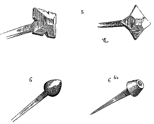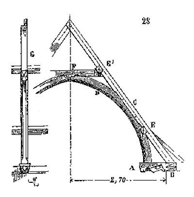 attachées en G à l'arbalétrier par des chevillettes de fer, en H à