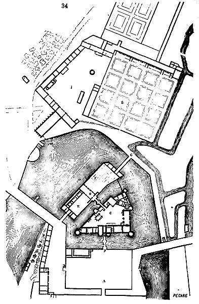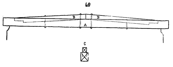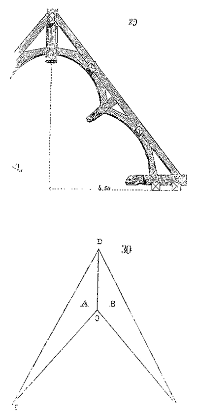 Le problème que les charpentiers anglo-normands avaient à résoudre êtait celui-ci: donner à deux triangles A et B (30) une base C D commune. Ce problème résolu, on pouvait se passer d'un entrait réunissant les deux sommets E F.