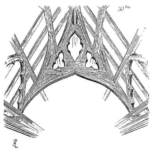 Une des fermes de la grand'salle de l'abbaye de Malvern (Worcestershire) qui date du milieu du XIVe siècle 12, indique bien nettement cette tentative des charpentiers anglo-normands. En voici la représentation perspective (30 bis). Cette ferme n'est en réalité qu'une sorte d'équerre composée de diverses pièces de grosse charpente dont l'assemblage ne forme qu'un triangle rigide. Les bois ont beaucoup de champ, mais peu de plat, et sont maintenus ensemble par de fortes languettes ou des prisonniers noyés dans leur épaisseur. On remarquera comme les pannes sont soulagées par des liens ou écharpes courbes A qui ont encore l'avantage de porter les chevrons et d'arrêter le hiement de toute la charpente. Il faut avouer que ce système exigeait l'emploi de bois énormes comparativement au résultat obtenu; c'était payer bien cher la suppression des entraits. Cette ferme n'a cependant qu'une très-médiocre portée, et ce moyen ne pouvait s'appliquer à des charpentes destinées à couvrir de larges vaisseaux. Aussi le voyons-nous abandonné forcément lorsqu'il s'agit d'exécuter des fermes d'une grande dimension.
